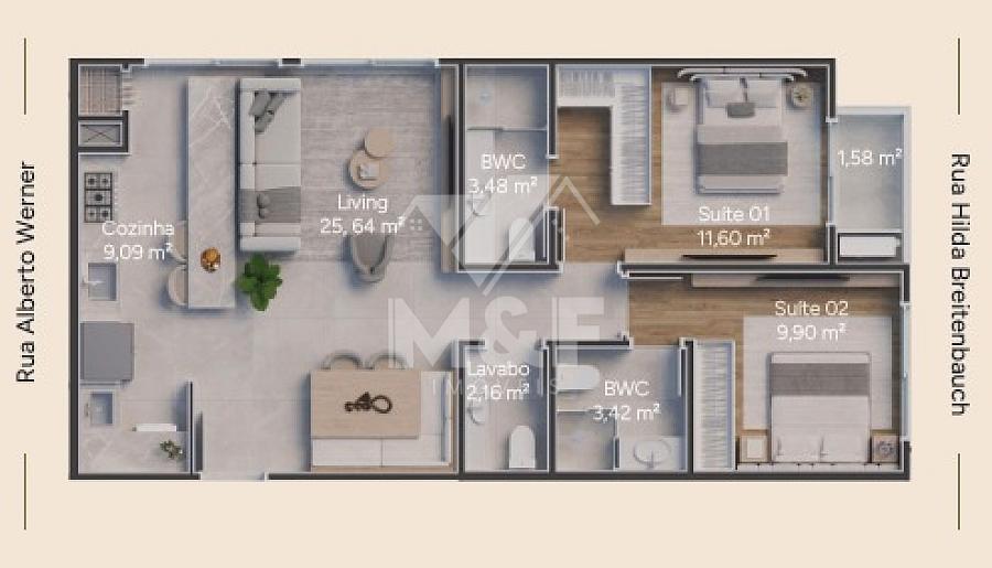 2 dormitórios (2 suítes)