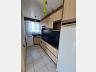 Fica no apartamento, cozinha completa com fogão, forno e geladeira, mesa, e máquina de lavar.